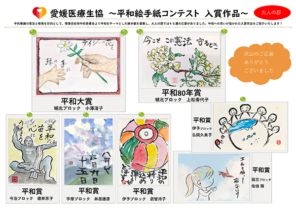 News & Topics Top News & Topics 2025.10.17 社会保障・平和 平和絵手紙コンテスト 入賞作品発表 平和絵手紙コンテストに大人の部 45作品の応募がありました。 厳正な審査の結果、入賞作品を決定しましたのでご紹介します。 なお、子どもの部には9作品の応募がありました。どれも力作です!子どもの部皆さんの作品をご紹介します。 < 前の記事へ 一覧へ戻る > 活動に参加するには 皆で楽しく、健康・医療・くらしについて考え、語り、活動しましょう! 詳細はこちら 詳細へ 加入するには 詳細はこちら 詳細へ