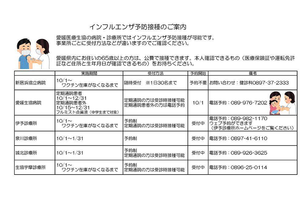 News & Topics Top News & Topics 2025.10.01 健康づくり・まちづくり インフルエンザ予防接種のご案内 愛媛医療生協の病院・診療所ではインフルエンザ予防接種が可能です。 事業所ごとに受付方法などが違いますのでご確認ください。 < 前の記事へ 一覧へ戻る > 次の記事へ > 活動に参加するには 皆で楽しく、健康・医療・くらしについて考え、語り、活動しましょう! 詳細はこちら 詳細へ 加入するには 詳細はこちら 詳細へ