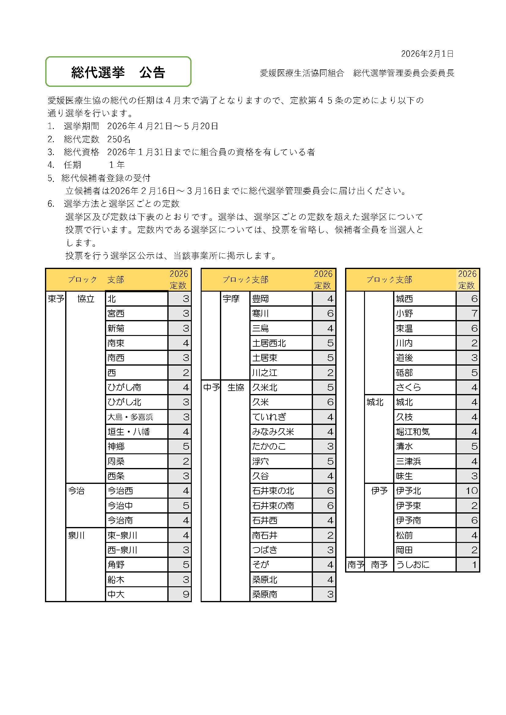 News & Topics Top News & Topics 2026.02.04 重要なお知らせ 総代選挙 公告 < 前の記事へ 一覧へ戻る > 活動に参加するには 皆で楽しく、健康・医療・くらしについて考え、語り、活動しましょう! 詳細はこちら 詳細へ 加入するには 詳細はこちら 詳細へ